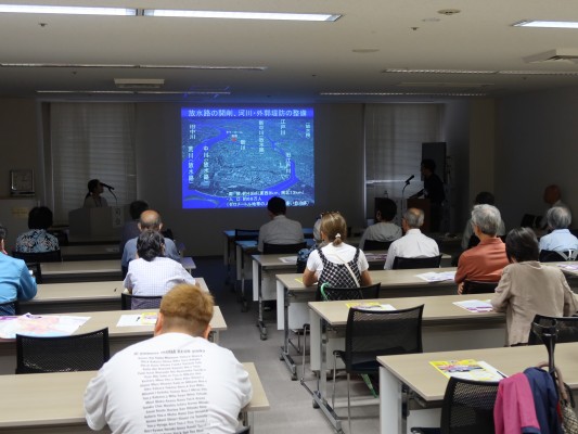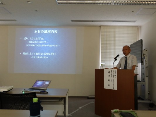 講演は2部構成となっており、まず近年の危険な暑さの現状や警戒の目安など非常に興味深いお話を藤井氏に、次にこの度改定された「江戸川区水害ハザードマップ」の説明を功刀氏にそれぞれご講演いただきました。