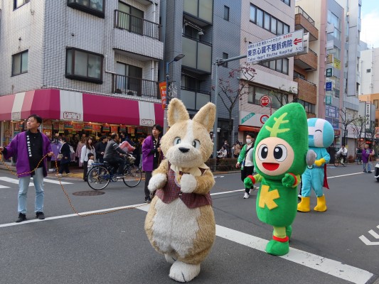 パレードでは、日本大学吹奏楽研究会がマーチングを行い、水素自動車や、商店街のキャラクター「こーた」をはじめ、小松川信用金庫のキャラクター「こまちゃん」や区クリーンエネルギー推進キャラクター「スイソマン」も参加し、大いに賑わいました。