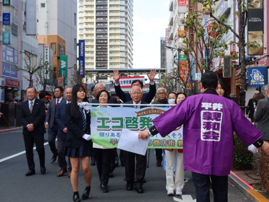 令和7年11月16日(日)、平井親和会商店街にてエコ啓発パレードが実施され、エコセンターも幟を掲げてパレードに参列しました。