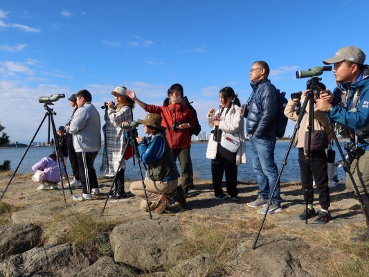 最初に、葛西海浜公園の西なぎさにて、生態教育センターの大原さんと平川さんから、ラムサール条約についての解説を伺った後、野鳥観察や葛西の海に生息する生きもの観察を行いました。